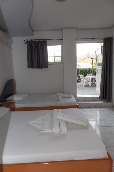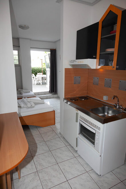 Τα studios μας είναι μονόχωρα επιπλωμένα και έχουν ένα διπλό και ένα ημιδιπλο κρεβάτι με πλήρως εξοπλισμένο πολυκουζινάκι ( ψυγείο, φουρνάκι και όλα τα σκεύη ), τηλεόραση, κλιματισμό και την βεράντα τους.